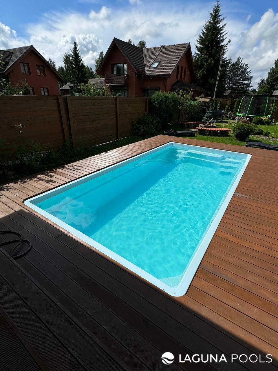 Прямоугольный композитный бассейн с деревянной террасой