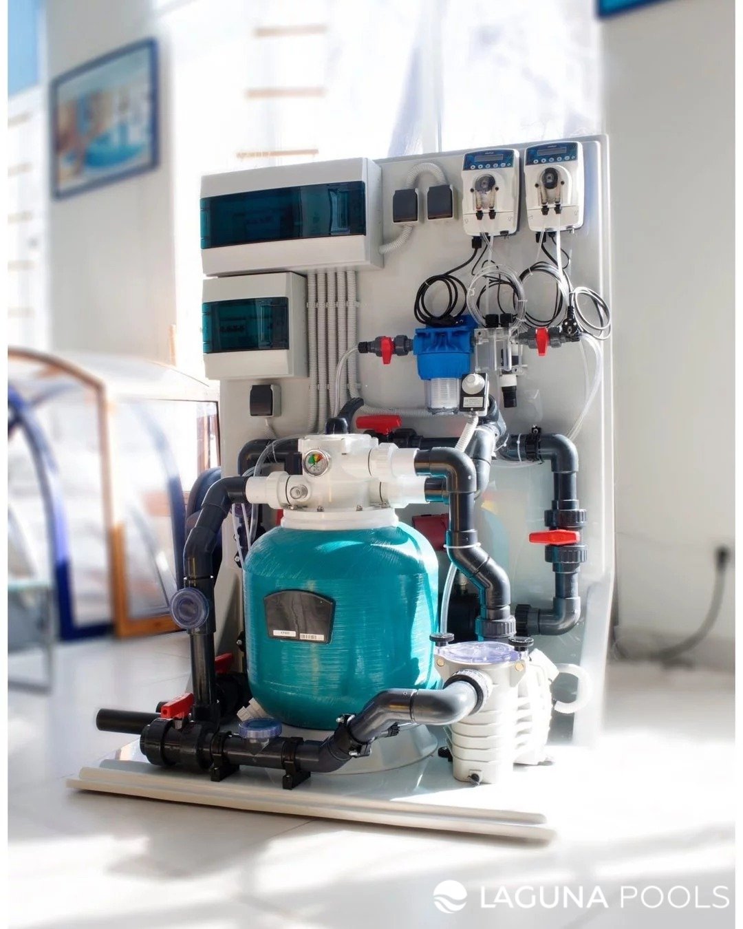 Система фильтрации и дозирования реагентов смонтирована на белой панели в светлом помещении.